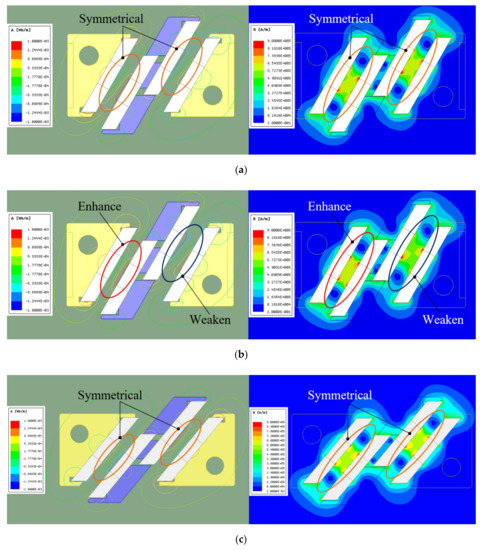 Although computationally time-consuming, the finite element method (FEM) [34] can precisely calculate the magnetic force and provide the corresponding magnetic field distribution. In this paper, it was used to validate analytical modelling results. The FEM model was established using electromagnetic-field finite-element software Ansoft Maxwell. Since the only excitation source for novel maglev coupling are permanent magnets, the FEM model can be categorized as a low frequency static magnetic field simulation. Figure 13 shows the 2D Maxwell simulation which illustrates magnetic flux line diagram and contour plot of maglev coupling with different and corresponding optimal , where the quantity is vector magnetic potential (Wb/m) and is magnetic field intensity(A/m). The value of optimal is taken from the blue curve in Figure 12.