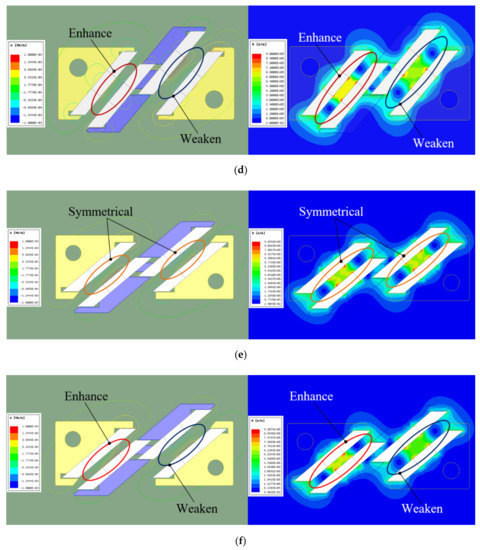 When LEMC’s coil is not electrified, as shown in Figure 13a,c,e, the external armature is in the neutral position, and the magnetic flux lines and magnetic field strength of the Halbach array are distributed symmetrically. Therefore, the internal armature is in the force-balanced state and there is no output torque. Once the LEMC’s coil is electrified, such symmetrical distribution will be broken, as shown in Figure 13b,d,f. When the external armature moves 1 mm, the magnetic flux density on the left air gap enhances and the magnetic field intensity becomes stronger, while the counterparts on the right gap changes in reverse. This difference changes on both sides of coupling causes the internal armature to output torque. The results of the FEM simulation are consistent with the working principle discussed in Section 2. In addition, the variation of and also have influence on the magnetic field of Halbach array, which are not so obvious as that of . This also reveals that the FEM simulation is incapable of obtaining optimal and , which further demonstrates the meaning of analytical modelling approach.