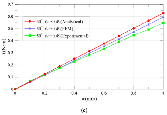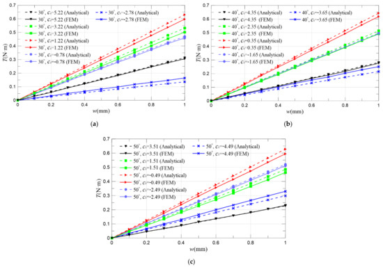 Verification for the parameter optimization with FEM simulation: (a) influence of on the torque–displacement characteristics with = 30°; (b) influence of on torque–displacement characteristics with = 40°; (c) influence of on torque–displacement characteristics with = 50°.