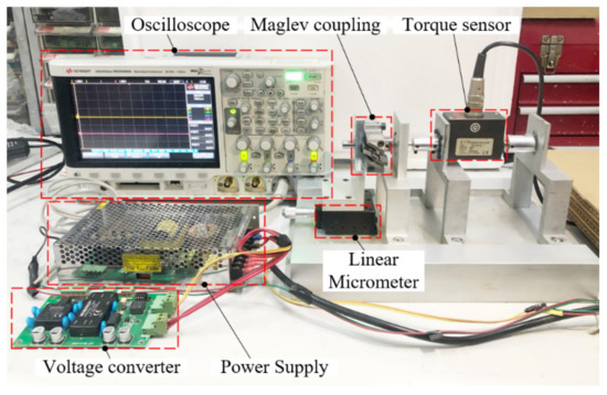 Based on the analytical modelling and FEM simulation, the main structural parameters of maglev coupling are determined, as shown in Table 4. Then, prototypes of maglev coupling with different and corresponding optimal are designed and manufactured, as shown in Figure 15. A special experimental platform for torque–displacement characteristics of maglev coupling is also designed and built, as shown in Figure 16. The experimental platform mainly includes an oscilloscope (MSO-X3054A), linear micrometer (HYB10-60LN) and torque sensor (DRFL-I-5-n-K) with its power supply (HY-250A-24) and voltage converter. The function of voltage converter is to convert the voltage of the power supply (24 V) into the voltage of the torque sensor (5 V). The external armature is fixed on a linear micrometer with a measuring range from −30 mm to 30 mm and an accuracy of 0.01 mm. The internal armature is magnetically suspended in the external armature, and its output shaft is connected with the torque sensor. By manually adjusting the linear micrometer, the external armature can move axially relative to the internal armature, and its displacement can be read by the linear micrometer. The output torque of internal armature can be measured by the torque sensor. The oscilloscope is used to display signals and collect data. In this way, the torque–displacement characteristics under different and corresponding optimal can be obtained.