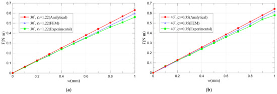 Figure 14 illustrates the comparison results. It can be seen that the FEM-simulated results are very close to the analytical ones, which verifies the correctness of analytical modelling. Varying and greatly changes the torque, regardless of the values of and , and the torque–displacement characteristics increase linearly. Figure 14a shows the influence of on the torque–displacement characteristics of the 30° maglev coupling. When varies from −2.78 to 1.22 mm, the output torque increases, and when varies from 1.22 to 5.22 mm, the output torque decreases, which verifies the one of the conclusions of Figure 12: when = 1.22 mm, the output torque of 30° maglev coupling is the largest. Similarly, Figure 14b verifies that when = 0.35 mm, the output torque of 40° maglev coupling is the largest, and Figure 14c verifies that when = −0.49 mm, the output torque of 50° maglev coupling is the largest. Comparing the red lines in Figure 14a–c shows that the output torque is the largest when = 40°, = 0.35 mm, which is consistent with the conclusion in Section 3.