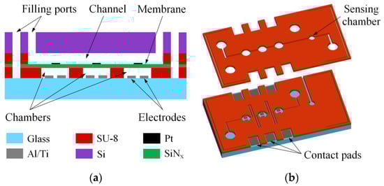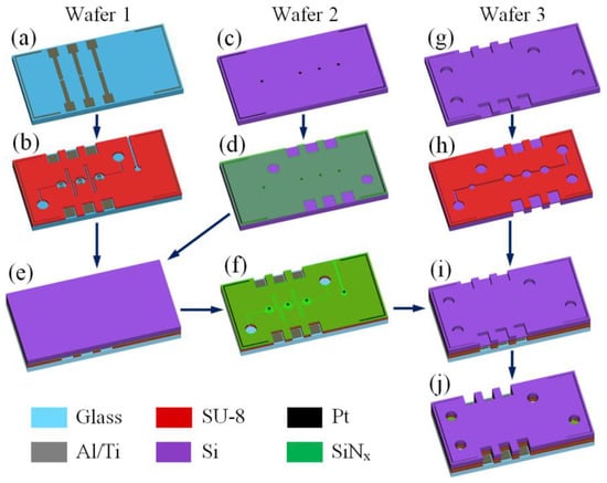 The fabrication procedure is shown in Figure 4. It requires six photomasks for the UV contact lithography and three 100 mm diameter wafers. The process begins with the formation of the electrodes, signal lines and contact pads on a 500 µm thick MEMpax glass wafer (wafer 1) using the lift-off technique (Figure 4a). For this purpose, a 1.7 µm thick mold of the photoresist OIR 907-17 is applied by spin-coating, exposed and developed. A 10 nm thick titanium adhesive layer is deposited by e-beam evaporation followed by the deposition of a two-layer Al/Ti film with a thickness of 500/200 nm. The rest of the photoresist is washed out with acetone and isopropanol. The two-layer structure results in a 2 Ω resistance between the electrode and contact pad. Further, the channels for electrolyte are formed in a 10 µm thick layer of photoresist SU-8 25 (Figure 4b). The soft bake and post exposure bake are carried out at 95 and 80 °C during 20 and 10 min, respectively. The hard bake in not performed in order to eliminate final cross-linking of the resist, and to keep the surface compliant for further bonding process.
