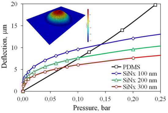 The deflection of SiNx membranes of various thicknesses from the range of 100–300 nm is calculated by the finite element method using verified software. Strictly speaking, for such a thin membrane the size-dependent effects can influence the mechanical behavior. These effects are related to microstructural phenomena, which are neglected in the classical continuum theory. In order to take them into account, nonlocal strain gradient models are introduced [,]. However, a specific scale, for which the size effects become important, remains an open question. The experiments with microfabricated beams demonstrated that the dependence of elastic properties on thickness manifests itself when the thickness goes below 150 nm [,,]. Since the chosen range of the membrane thickness mostly exceeds this value, and for the sake of simplicity, we make the calculations using the classical elasticity theory and bulk material properties of SiNx. The results are shown in Figure 2. At the pressure of 0.1 bar, a 200 nm thick structure provides the deflection similar to that for the PDMS membrane. Therefore, this thickness is chosen for the fabrication. The stress in the membrane reaches 1.9 GPa, which is several times lower than the fracture strength 6.9 GPa of silicon nitride thin films []. It was demonstrated that micromechanical structures fabricated from low stress LPCVD SiNx withstand up to 109 loading cycles at the stress amplitude of 5.8 GPa without fatigue-induced degradation or failure []. Therefore, the fatigue phenomenon should not limit the performance of the pump.