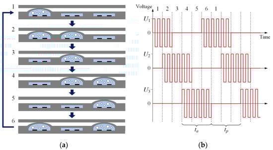 In the pump the fluid is pumped due to the peristaltic movement of the actuators. Peristalsis is a simple and reliable pumping method that is widely implemented in microfluidics using actuators of various types [,,,,]. The actuators operate in the sequence shown in Figure 3a. They create a peristaltic wave and push the liquid from left to right. The pumping cycle consists of six phases. In each phase, at least one membrane is lifted, preventing the back flow. This sequence is set by the driving signals shown in Figure 3b. A series of AP voltage pulses with a frequency f~100 kHz is applied to each actuator during the active time ta. The membrane rises and displaces the liquid. During the passive time tp, the pulses are switched off and the membrane returns to its initial position. The signals have the same shape for all the actuators, but for the middle and right devices it is shifted by 2ta/3 and 4ta/3, respectively.