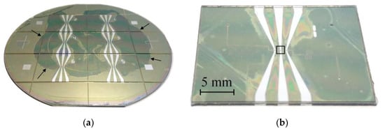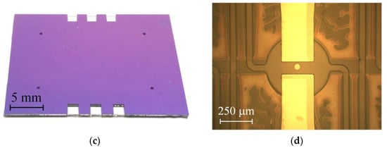 The fabricated assembly containing six samples is shown in Figure 5a. One can see the dark spot in the central part, where SU-8 is well bonded to SiNx. Typically, this spot covers about half the wafer area. Due to incomplete bonding, only 60% of the samples have hermetically sealed channels. The assembly is divided into separate chips manually. The glass and silicon sides of the chip are shown in Figure 5b,c, respectively. The sample has a sufficiently large size of 28 × 22 mm2 chosen for the convenience of connecting the microfluidic tubes. In addition, it allows one to design the channels long enough to observe the pumping by meniscus movement. Figure 5d shows a close-up view of the actuator. Light spots around the chamber and channels are the areas of poor bonding. For this sample the bonding provides no leakage, and it is strong enough to withstand the pressure above 5 bar in the channels, but the process has to be improved in order to increase the bonding quality and fabrication yield. This can be achieved by optimizing the thermal treatment of SU-8 and bonding conditions.