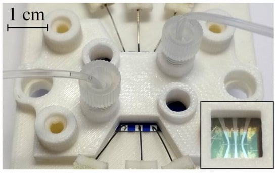 To test the pump, a holder is designed and fabricated using a 3D printer. The chip is placed on the lower platform glass side down and pressed by the upper platform using screws, as shown in Figure 6. The lower platform contains six tungsten probes, which are installed on the contact pads of the sample and provide driving signals to the electrodes. In addition, it has an opening to observe the movement of the membranes and the meniscus in the channel. The upper platform has four ports for connecting the microfluidic tubes with the outer diameter of 0.5 mm using nuts and ferrules. The actuators are filled with the electrolyte, which is a molar solution of Na2SO4 in distilled water. The channel for the pumped liquid is filled with distilled water. The holder is installed onto a stage of the microscope equipped with a Moticam 1SP camera. In order to verify the pump for leakage and membrane movability, the pressure is created in the channels using a syringe. The deflection of the membranes under this pressure is detected by the platinum discs coming out of focus of the microscope, as demonstrated in Video S1.
