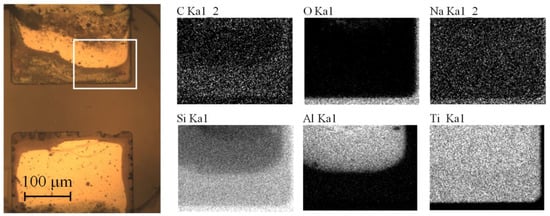 In order to explain the formation of the long-lived visible bubbles, an additional experiment is performed. The glass substrate with the electrodes is detached from the assembly and placed in a Petri dish filled with the electrolyte. This configuration allows observation of the working surface of the electrodes. The AP pulses with Ua = 10 V are continuously applied to one electrode during 60 s, while the other electrode is grounded. As well as in the pumping regime, the gas production is observed. It is accompanied by the degradation of the electrodes, which visually appears as the darkening of their edges, see Figure 7. After the test, the chemical composition of the sample is investigated with the energy-dispersive X-ray (EDX) spectrometer Oxford Instruments INCA X-act, which is installed into the scanning electron microscope (SEM) Zeiss Supra 40. The maps of chemical elements are shown in Figure 7. The dark region contains less aluminum than the undamaged one, while the titanium content is the same in both areas. In addition, the dark region demonstrates higher content of silicon. It means that X-rays coming from the glass substrate are blocked by the damaged part to a lesser degree compared to the undamaged electrode area. To all appearance, aluminum is removed from under the titanium working layer during the AP electrolysis, and this process is accompanied by the generation of visible bubbles.