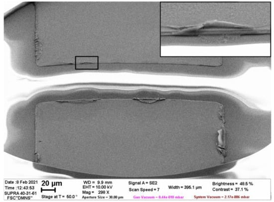 Al/Ti electrodes have been used previously in the fast electrochemical actuators [,,] and in several experiments on the AP electrolysis [,,,]. They can be recommended as rather durable structures, which are able to withstand extremely high current densities ~100 A/cm2 for long time. The degradation of the electrodes manifested itself as the oxidation of the titanium working layer, but no removal of aluminum was observed. Probably, this phenomenon takes place in the micropump due to a change in the fabrication technology. Previously, the electrodes were patterned by wet etching, but here the lift-off technique is used. The lift-off provides a sharper edge of the film and may cause fence-like structures, which act as preferable sites for the formation of the pinned bubbles during the electrolysis. The defects at the electrode edge are shown in Figure 8. Further, we plan to correct the fabrication procedure in order to avoid gas generation and removal of Al that will allow the investigation of the pump performance in various regimes.