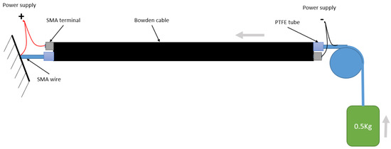 6) represents the thermal behavior of the SMA wire, regardless of whether the SMA-based actuator is a composite from one or more SMA wires with a Bowden cable and polytetrafluoroethylene (PTFE) tube. In this case, the influence of the Bowden cable should be added to Equation (