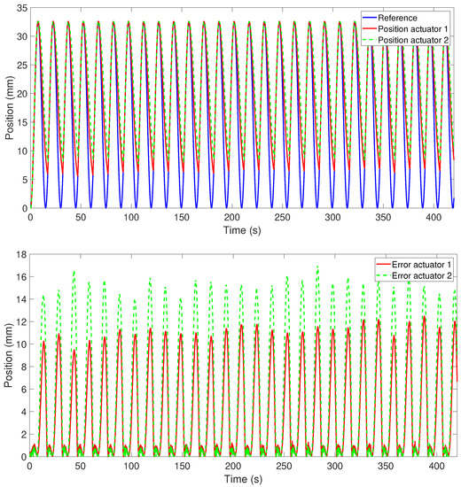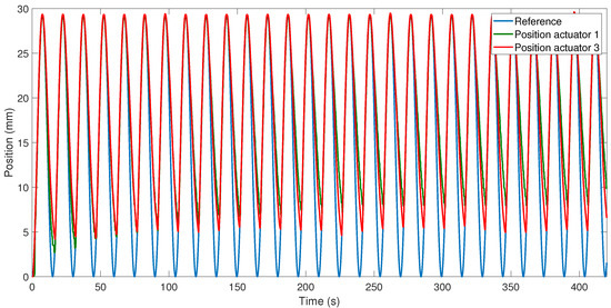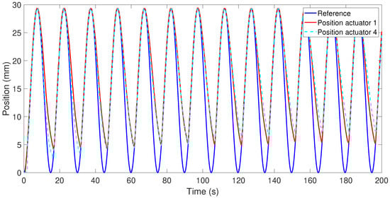 The position response of Actuators 1 and 4 (the double actuator), when the reference was a sine wave with an amplitude of 29.28 mm and frequency of 0.0668 Hz, is shown in