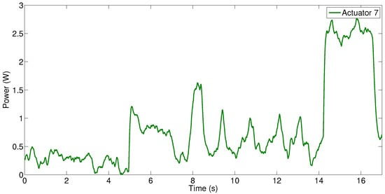 Actuator 7, a servomotor, was tested with a payload of 3 kg and a step reference (from 0 to 80 mm and return). During this test, the electrical power consumption, as presented in