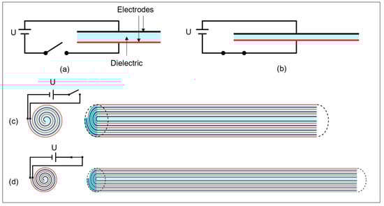 Among the many possible types of DEA configurations, rolled DEAs (RDEAs) have received significant consideration in the literature. In a RDEA, the dielectric polymer and the electrodes are tightly wound in a spiral-like or cylindrical form. The application of a voltage across the electrodes produces a radial Maxwell-stress which, in turn, results in an axial expansion of the roll, as shown in Figure 1c,d. Compared to alternative DEA configurations, RDEAs can be designed in a very slender cylindric shape. In this way, they can generate large uniaxial forces and moderate strokes with a very compact form factor. Furthermore, their particular shape makes it possible to bundle together several rolls, thus allowing to design highly energy-dense actuator systems. Among the most promising fields of applications for RDEAs, it is worth mentioning artificial muscle fibers for soft robotics applications [,].