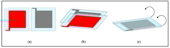 For implementing the CORDEA, two layers of silicone film are considered. A different electrode pattern is applied to each film, see Figure 2a. The two electrodes are depicted in red and grey for illustrative purposes only, while in reality they are both made out of carbon black. Note that the two electrodes are a mirror image of each other, and also include the areas for implementing the electrical connections. One of the films has a cutout on one corner, for allowing contact to the electrode of the film below. For simplicity, a rectangular electrode geometry is chosen for the active film area. It is remarked how mathematically optimized electrodes could potentially offer even higher strains, compared to regular ones []. However, this possibility will be investigated in future works. Both electrodes are stacked on top of each other (Figure 2b), and subsequently rolled (Figure 2c).