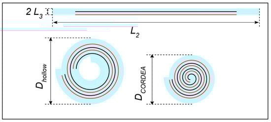 Based on the rolling concept described above, both hollow and core-free RDEAs can be manufactured, as described in the corresponding section. Figure 3 shows a simplified cross-sectional view of the stacked films before rolling, as well as a hollow RDEA previously presented and a CORDEA proposed in this work.