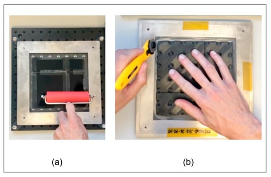 - The frames are put into a jig, and a hand roller is used to adhere the films onto the support sheets, as shown in Figure 4a.