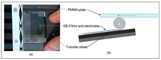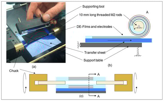 The rolling process represents the main improvement of this work concerning RDEA manufacturing. To begin with, we consider two DE films with screen-printed electrodes adhered to a transfer sheet. The process previously developed in [] is briefly summarized in the following. Figure 5a shows the rolling fixture, and a cross-sectional view of the process is shown in Figure 5b, while a longitudinal cut is shown in Figure 5c.