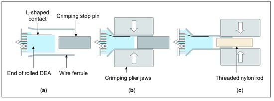 Schematic depiction of the crimping process. One end of the rolled DEA with the exposed L-shaped contacts and a crimping stop pin with a defined diameter is inserted into the ferrule (a). Radial crimping pliers are used to crimp the ferrule (b). Finally, the crimping stop pin is removed, and the threaded nylon rod is crimped (c).