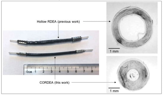 By employing the above-defined process, we were able to manually roll and crimp four CORDEAs with defined dimensions in one hour. A picture of two manufactured RDEAs, namely a hollow and a core-free one with identical film and electrode geometry, is shown in Figure 8. Using a scalpel, a thin slice of each RDEA is cut and observed in a transmitted light microscope to examine their inner structure, as shown in Figure 8.