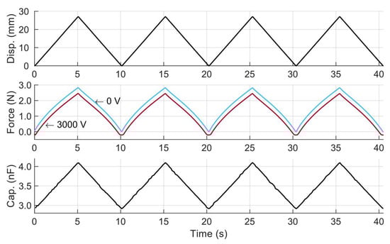 As a subsequent step, a hollow specimen and a CORDEA are evaluated and compared. Both rolls are manufactured with the same film and electrode geometry, according to Table 2, but differ in terms of rolling configuration. A triangular displacement is applied at a frequency of 0.1 Hz, with an amplitude ranging from 0 up to 40% of the unstretched electrode length Lel,1,0, while the force is measured. The experiment is repeated twice, with the RDEA subjected to a constant voltage of 0 V and 3000 V, respectively. For 0 V, the capacitance is also measured via the LCR meter (Figure 11).