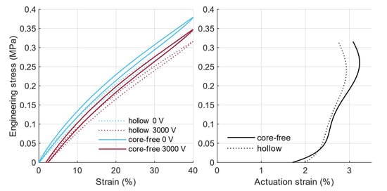 Stress plotted against strain for the hollow and core-free versions of the RDEAs (left-hand side) and the actuation strain (right-hand side). The actua-tion strain is calculated based on a fifth-order polynomial fitted on the loading and unloading branches of the 0 V and 3000 V stress-strain-curves, respec-tively.