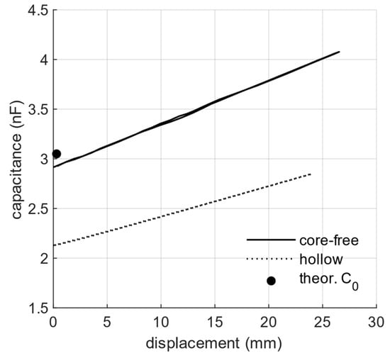 Next, electrical capacitance measurements for 0 V are conducted. According to the datasheet of the measurement device (HAMEG HM8118 LCR Bridge), the accuracy for the corresponding measurement range and settings is at least 0.12%. We verified the influence of the experimental setup by measuring the capacitance at 0% strain multiple times. The reported capacitances were consistently measured with a relative error of less than 1%. Figure 13 shows a linear relation between capacitance and displacement for both RDEAs. From this figure, it can be concluded that RDEAs can be effectively used as self-sensing actuators.