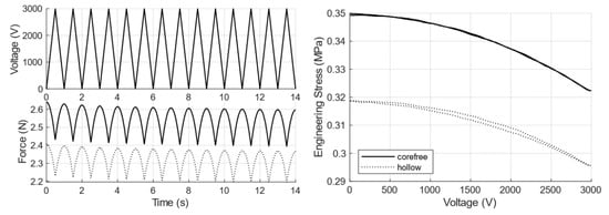To further verify the feasibility of the CORDEA as an actuator, blocking force measurements are conducted. In this case, both RDEAs are kept under a constant strain of 40%, while a triangular voltage signal between 0 V and 3000 V at 1 Hz is applied. From those measurements, a stress-voltage graph can be computed (Figure 14).