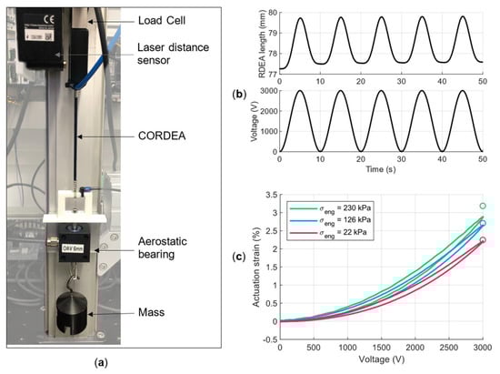 The experimental setup for measuring the characteristics of specimen 2 of the CORDEA (a). The applied voltage signal and the measured length plotted over the time for an attached weight that exerts a force of 2.17 N, corresponding to an engineering stress of 230 kPa, are shown in (b). The resulting actuation strain depending on the voltage for different constant loads is depicted in (c). The circles represent the expected strain based on the measurements of CORDEA specimen 1 shown in Figure 12.