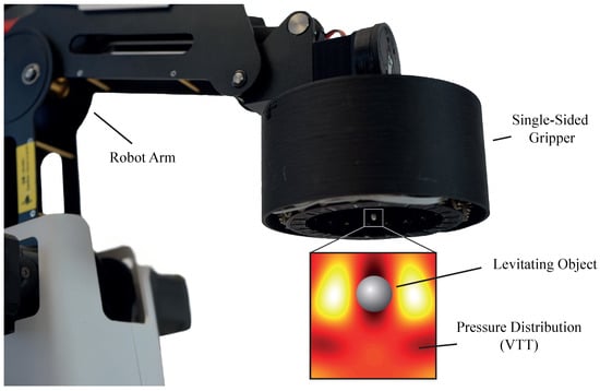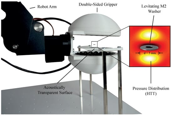 Thus, objects of any material can be transported and positioned without mechanical contact, i.e., with low stress on the object and without contamination. However, the transport range is limited to the range of the acoustic field. To increase this range, the device that generates the acoustic field can be mounted to a robot arm as a gripper, as shown in Figure 1 and Figure 2 [22].