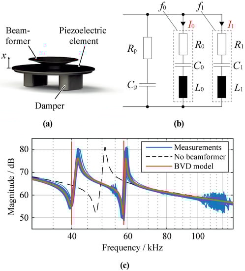 The peak pressure value generated by a piezoelectric transducer is proportional to the deflection of its vibrating element. The deflection is measured in the x direction as shown in Figure 3a and depends on the charge stored in the piezoelectric element [26]. Consequently, the current flowing through the piezoelectric element is the relevant quantity regarding pressure generation. The corresponding equivalent circuit based on a Butterworth-Van Dyke (BVD) model [27] is shown in Figure 3b. It has no significant effect on the resulting pressure whether a square wave or sinusoidal voltage signal is applied to the transducers, since the frequency-dependent impedance of the transducers, which is shown in Figure 3c, suppresses higher order harmonics.