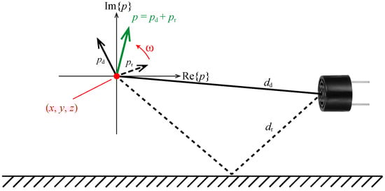 If an acoustically reflective surface is present within the acoustic field, the pressure generated by a single transducer at a point contains an additional component caused by the reflected wave () [37,38]. The total pressure oscillation has the same frequency as the pressure oscillation without the reflection, but the phase and magnitude are different. This can be illustrated by a pointer diagram, as shown in Figure 4. If the direct pressure component is constructively superimposed with the reflected pressure component , a higher pressure amplitude is achieved. Due to the change in phase, the control has to be adjusted according to Equation (4) with R set to the appropriate value. If the transducer arrangement is shifted relative to the reflecting surface, the influence of the reflected wave on the phase of p changes, which has to be taken into account by the control.