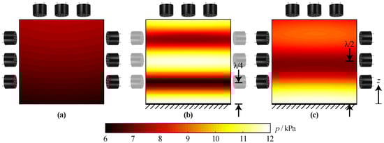Using the reflection of sound waves at a surface, a standing wave can be formed between the transducers and the surface by focusing the acoustic pressure on the surface. The distance between the oscillating elements of the transducers and the reflecting surface should be a multiple of to achieve a high pressure magnitude [39,40].