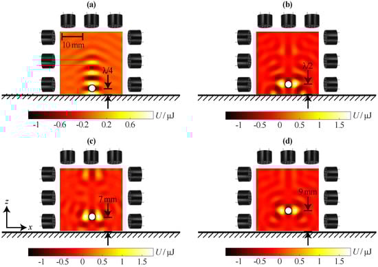 If the acoustic sources are located far away from the surface, the acoustic waves are perpendicularly incident upon the surface. The DMAP for the transducers arranged at the horizontal top of the single-sided arrangement, which are placed at a distance of from the reflective surface, is shown in Figure 5b. Due to the pressure minimum being formed at above the reflective surface, it is impossible to focus the pressure around this location, which would be necessary to generate a twin trap.