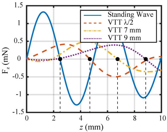 Vertical forces for a standing wave with a minimum at and VTTs at , , and . The forces are obtained for an acoustically reflective surface () at .