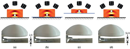 Picking an object from an acoustically reflective surface is more challenging than picking it from an acoustically transparent surface. The reflection of a wave at a surface does not cause a phase shift. If the incident wave arrives perpendicular to the surface, the superposition between the incident wave and the reflected wave causes a pressure minimum to be formed at a distance of from the surface, as outlined by Equations (6)–(8) [39,40].