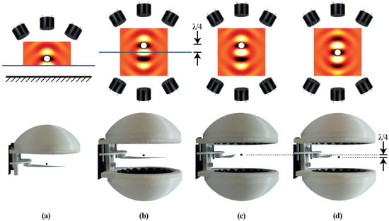 Process of lifting an object located at the lowest pressure minimum in a standing acoustic wave. (a) A standing wave between the transducer arrangement and an acoustically reflective surface is formed. The object is trapped in the lowest pressure minimum of the standing wave. (b) A thin reflector is inserted directly above the reflective surface. (c) The reflector is moved upwards until the levitating object reaches the levitation height of the second pressure minimum of the standing wave between the transducers and the reflective surface; (d) the reflector is removed and the object is located at the second pressure minimum. The shown elements correspond to those annotated in Figure 8.
