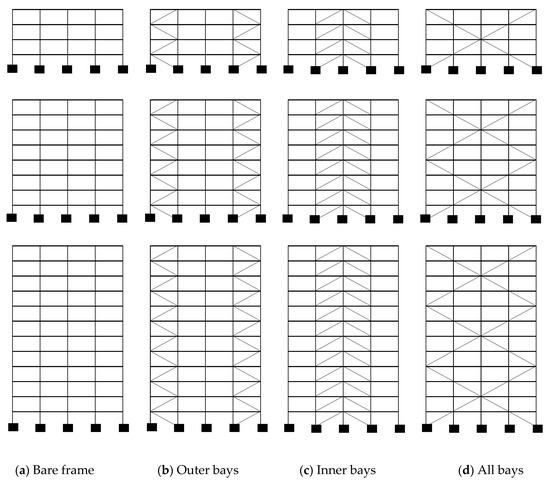 In this parametric study, a set of three different frames was employed to investigate the seismic protection capability of BRBs and VDs. For this purpose, 4, 8, and 12-story bare structures were designed as steel moment-resisting frames (MRFs) in accordance with Eurocode-3 and Eurocode-8 [36,37]. The story height and bay width of the frames were equal to 4 and 6.5 m, respectively. The bare structures have columns of HEA sections and beams of IPE sections. The fundamental periods of 4, 8, and 12-story frames were obtained as 0.64, 1.15, and 1.54 s, respectively. Figure 1 presents the elevation views of bare frames. Moreover, the placement of the BRBs and VDs throughout the each frame elevation is given in Figure 1.
