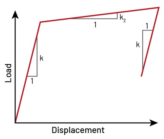 where A is the total cross-sectional area, E is the modulus of elasticity, is the length of beam member, α is the ratio of the decreased cross-sectional area to the whole area, β is the ratio of the length of the decreased core to the whole length, and is the deformation after yielding. In the nonlinear analyses, non-buckling bracing with a uniaxial plasticity property (see Figure 3) was modeled using a Multilinear plastic (MLP) link element in SAP 2000. Thus, MLP link creates an element that is linearly elastic up to yield after that the plastic region can be multilinear to include strain hardening. The effective stiffness assigned to the MLP link element was 30 kN/mm and a 3% strain hardening was considered.