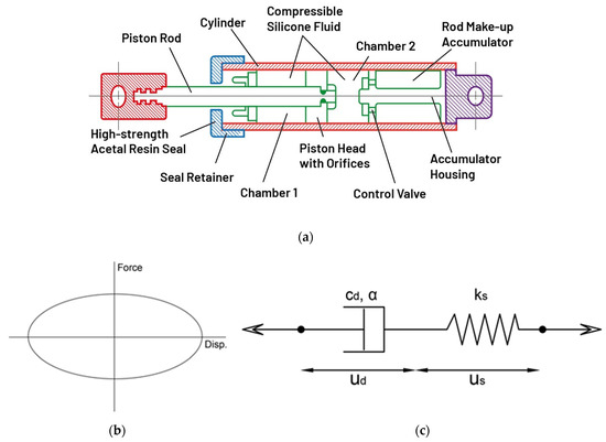 (a) Section view of viscous damper (VD), (b) idealized force–displacement relationship for VD, (c) schematic view of Maxwell model (Adapted with permission from [30]).
