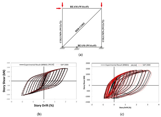 (a) Geometry of the BRB-testing frame (Adapted with permission from [49,50]) and verification of SAP 2000 model against the experimental results of BRB (b) BRB05 and (c) BRB01.