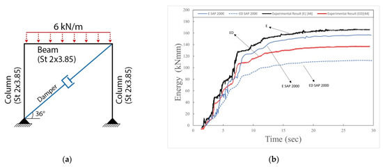 To test the performance of the SAP 2000 model containing the viscous damper, the research of Constantinou and Symans [44,51] was used. They conducted an experimental work on the seismic response of buildings upgraded with supplemental viscous dampers. For this purpose, the frame scaled to 1:4 size (Figure 6a) was designed as a one-story small structural system and tested on a shaking table simulating the natural earthquake scenarios. The damper used was a linear damper with α = 1 and a damper coefficient of 15.45 Ns/mm. The effect of viscous dampers on the behavior of the structural system to which they are attached is illustrated in graphs of the time history of the energy dissipated by various mechanisms in the structure. Figure 6b shows the energy time histories for the one-story structure subjected to the Taft earthquake. The input energy (E) and the energy dissipated by the viscous damper (Ed) are compared. It was observed that numerical model by SAP 2000 agreed well the experimental results.