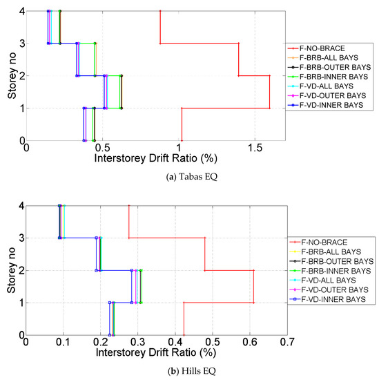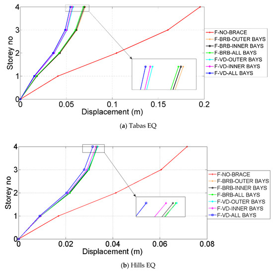 Variations of the displacements over the four-story steel frames with and without protective systems are depicted in Figure 7. The figures provided herein corresponded to the maximum and minimum displacement demands of the original frame, respectively. For instance, the Tabas earthquake gives the highest displacement of 22 cm, while the Hills earthquake results in the minimum displacement of 7 cm in the four-story models. When the VDs and BRBs were introduced to the bare frames, the relative displacements reduced remarkably from 22 cm to 5 and 7 cm, respectively. Thus, the lateral displacement demand decreased by about 77% and 68% by using VDs and BRBs, respectively. Hence, the contribution of BRB was 9% lower than that of VD as long as the reduction in the lateral displacement was taken into account. For a given protective system, the configuration has played a marked role. The all-bay systems of VDs or BRBs had better performance in reducing the displacement demand than the inner and the outer configurations.