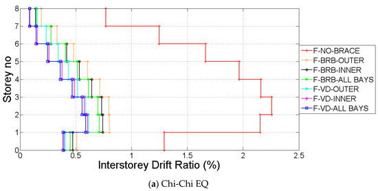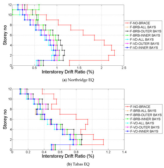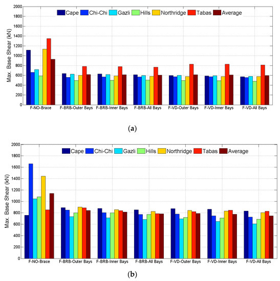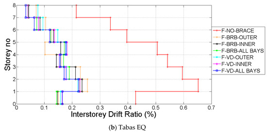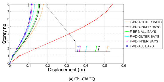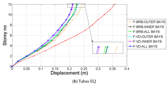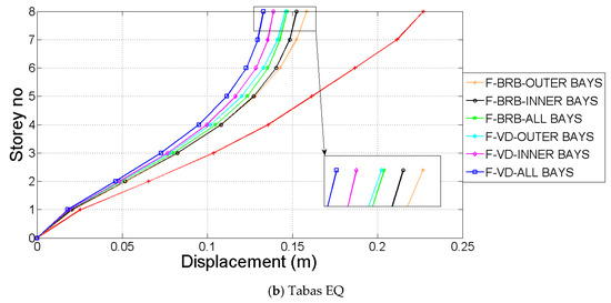As seen in Figure 8, the maximum and minimum lateral displacements over the eight-story bare frames were 55 and 23 cm, respectively, which were achieved under the Chi-Chi and Tabas earthquakes. The most effective seismic device configuration seemed to be the all-bay system, irrespective of the ground motion exerted. As seen in Figure 8a, use of the VD and the BRB in all-bay systems provided 80% and 72% lower displacements, respectively, which decreased to 76% and 67% as long as the outer-bay system was employed. Moreover, Figure 8b suggests the effects of using VDs and BRBs to decrease the lateral displacement by about 48% and 30%, respectively. Therefore, it was clear that the rate of influence of using protective systems varied on the basis of the earthquake type.
