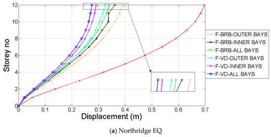 Figure 9a presents the maximum displacement demand for the 12-story frames under the Northridge earthquake. The Tabas earthquake, which yielded the maximum displacement demand in the case of four-story frames, provided the minimum values for both 8- and 12-story models. Like four-and eight-story frames, the all-bay configuration of both VDs and BRBs suggested the most favorable pattern. The former and the latter caused the maximum displacement of 70 cm to decrease to about 25 and 30 cm, which corresponded to 64% and 57% less lateral displacement demand, respectively. Those contributions of VD and BRB appeared to lessen in the case of inner and the outer-bay systems. For the latter, the effect of VD was 56%, while that of BRB was only 44% under the Northridge earthquake. Therefore, when the seismic protection pattern switched from the all bay to the outer bay, the VD and BRB had a lower influence by as much as 8% and 11%, respectively, on decreasing the lateral displacement. Moreover, the VDs showed better performance compared to the BRBs of the same configuration. It was noticeable that the percentage of the displacement reductions by using the seismic protection systems in the four-story model were higher than those in the eight-story model; hence, these reduction values in 8-story were higher than 12-story. Therefore, the VD and BRB systems have many effects on the reduction of displacement demand of the buildings under near-fault motions, so that these effects seemed to be considerable in small buildings in comparison with high-rise buildings.