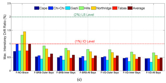 The maximum interstory drift ratio in (a) 4-, (b) 8-, and (c) 12-story frames.