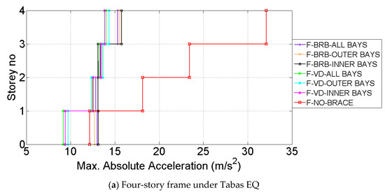During an earthquake, the structures suffer damage, mainly because of the relative variation of maximum absolute acceleration with story level displacement of building stories to each other and acceleration developed at the building floors. The role of seismic protection, therefore, is to decrease the absolute acceleration. In this section of the present paper, the maximum acceleration of each building floor as an important parameter in assessing the effectiveness of the protective systems under the near-fault earthquake excitations are discussed. Figure 14a,c show the absolute acceleration distribution of each story at 4-, 8-, and 12-story buildings, respectively, for the bare and VD and BRB modified models.