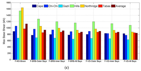 Maximum base shear in (a) 4-, (b) 8-, and (c) 12-story frames.