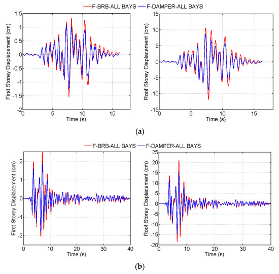 Time history of the first and the roof story displacements in the 8-story models with BRBs and VDs placed in all-bays configurations under earthquakes showing the minimum and the maximum values are illustrated in Figure 16. It was evident that the use of VDs appears to be more effective than BRB in reducing the displacement, especially at the roof level, irrespective of the story numbers in the buildings. As seen in Figure 16, the maximum displacements at the first and the roof stories in the eight-story building were reported to be 2.5 and 21 cm, as measured under the Northridge earthquake.
