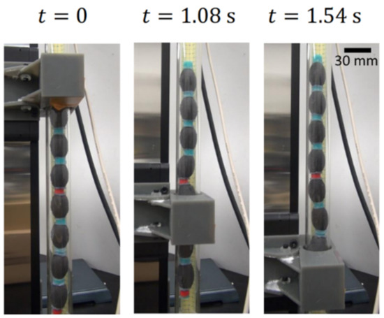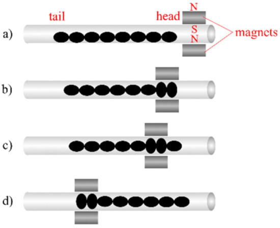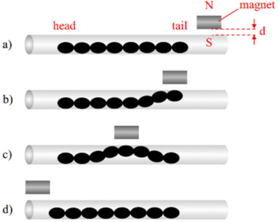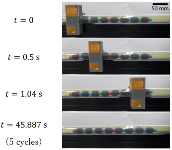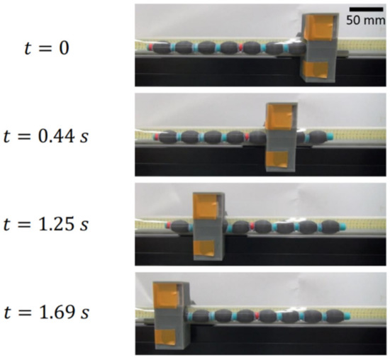 Figure 2 illustrates the mechanism for peristaltic locomotion. Two magnetic field sources were positioned above and below the crawler respectively. In this experiment, two permanent magnets were used as the magnetic field source. The magnets were moved along the body of the crawler, from the head to the tail. When the magnets were directly above/below a given section of the crawler, the ellipsoidal MAE units of that section of the crawler were attracted to the magnetic field. The ellipsoidal units actuated due to the magnetic force, widening along the short axis, parallel to the magnetic flux, and shortening along the long axis, perpendicular to the magnetic flux. The tail end of the crawler was pulled forwards by this actuation (in the opposite direction to the motion of the magnets). The number of ellipsoidal units within the area ‘under the magnets depends on the relative size of the magnets. In this experiment, magnets of dimensions were used, meaning a length equivalent to two ellipsoidal units was accommodated between the magnets at one time (Figure 2b–d). As the magnets were moved along the length of the crawler towards the tail end, each ellipsoidal unit was sequentially actuated when exposed to the magnetic field and then relaxed when the magnetic field was released. Due to the restoration force of the elastomer, the units returned to their original shape and the head of the crawler extends forward. The ellipsoidal unit are sequentially exposed to the magnetic field and the deformation propagates from head to tail.