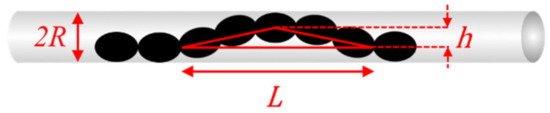 The amplitude can be expressed as . The length of the half-wave created in caterpillar motion also depends on . Since these two half-wave parameters determine the displacement travelled by the crawler in one cycle (Equation (2)), is determined by . In contrast to peristaltic motion, is not a factor in calculating the displacement by the crawler. Using Equations (1) and (2), and assuming the actuated MAE unit widens until it touches the wall of the pipe, the estimated displacement, , travelled by a crawler with ellipsoidal units can be expressed as: