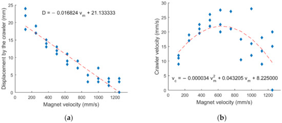 The relationship between the displacement by the crawler in a single cycle and the traveling velocity of magnet is seemingly an inverse linear relationship, which is within expectation as the rate of change of magnetic field at any position is higher while the response time by MAE remains the same. As a result, the MAE ellipsoid may not reach full deformation during the period it is exposed to the magnetic field. The crawler should therefore move by a smaller distance when the magnet moves faster.